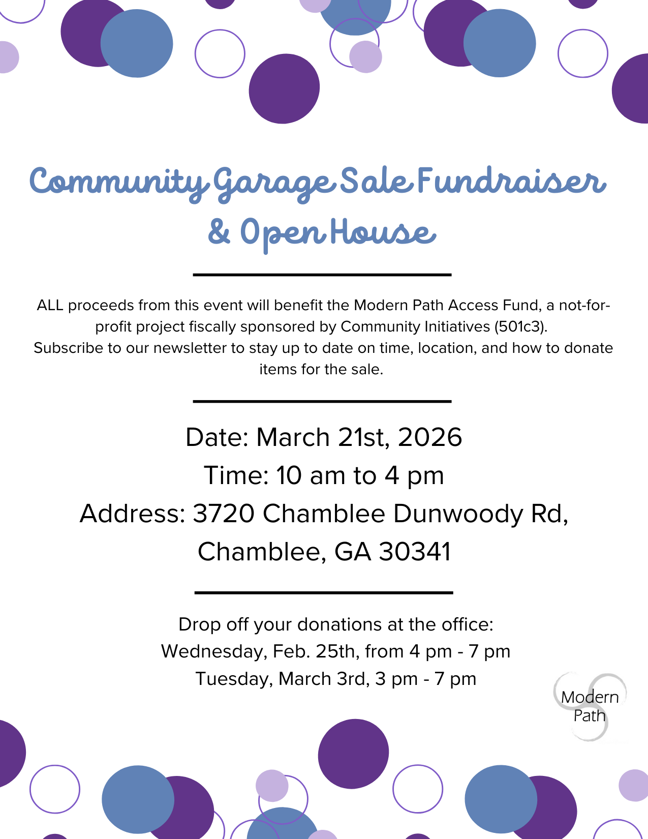 This event is a fundraiser for the Modern Path Access Fund. 100% of the proceeds will support this fiscally sponsored not-for-profit project, administered by Community Initiatives (501c3).