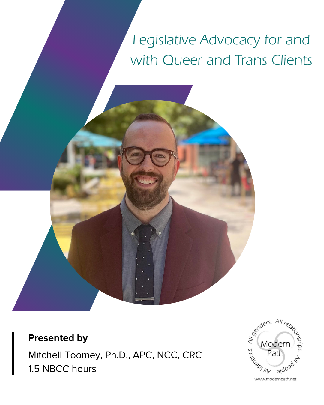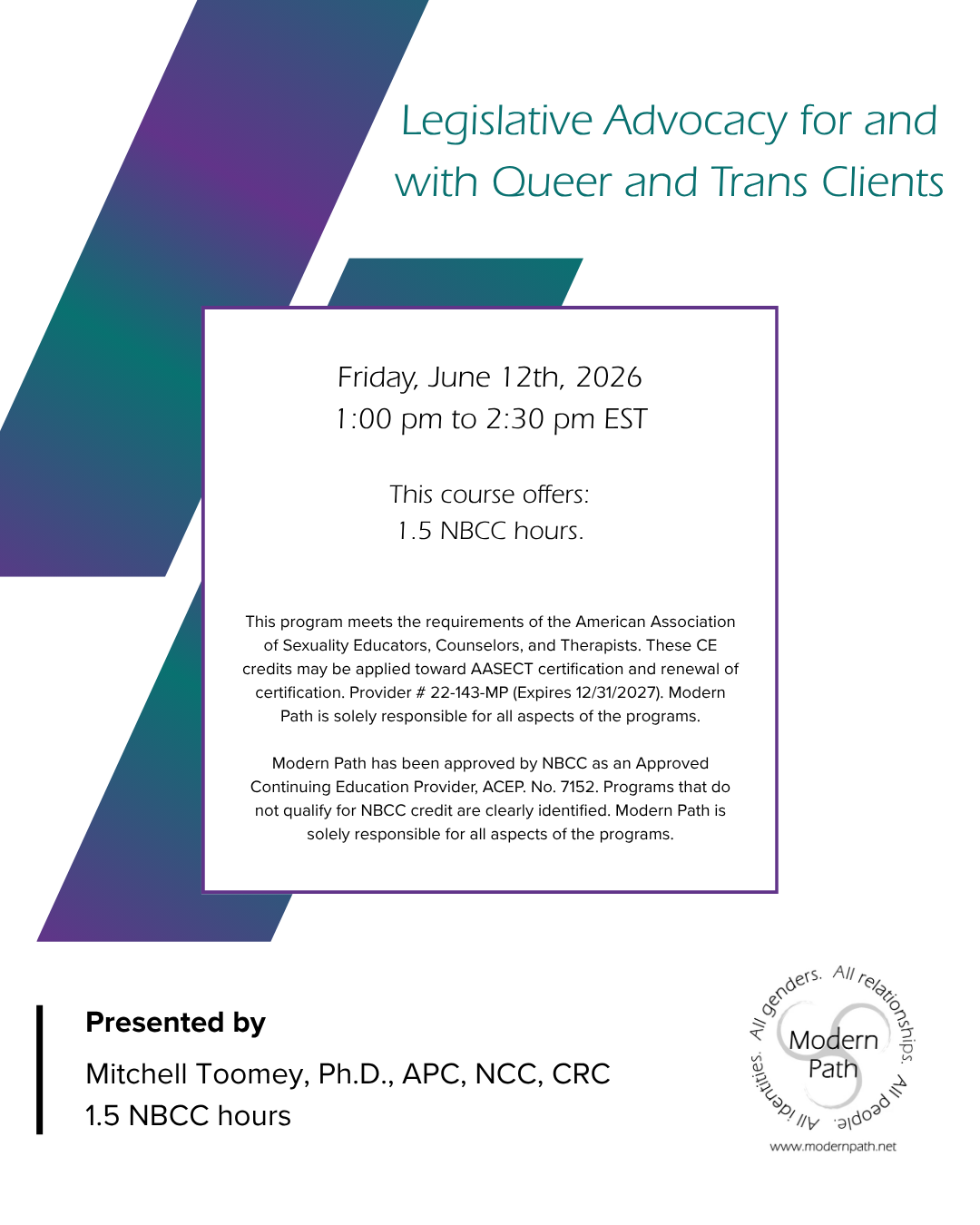 This class explores how legislative and policy environments influence the mental health, healthcare access, and wellbeing of LGBTQ+ individuals. Participants will examine recent legislative trends affecting queer and trans communities and discuss how these broader systems shape clinical experiences and outcomes. The workshop also reviews relevant ethical guidelines from major helping professions that support advocacy as part of ethical practice. Using an ecological systems framework, participants will consider how advocacy can occur at micro, meso, and macro levels within professional roles. Practical examples will illustrate ways clinicians and healthcare providers can support clients affected by policy-related stress and systemic barriers. Participants will leave with concrete strategies for ethically engaging in advocacy that supports equitable access to care for LGBTQ+ communities.