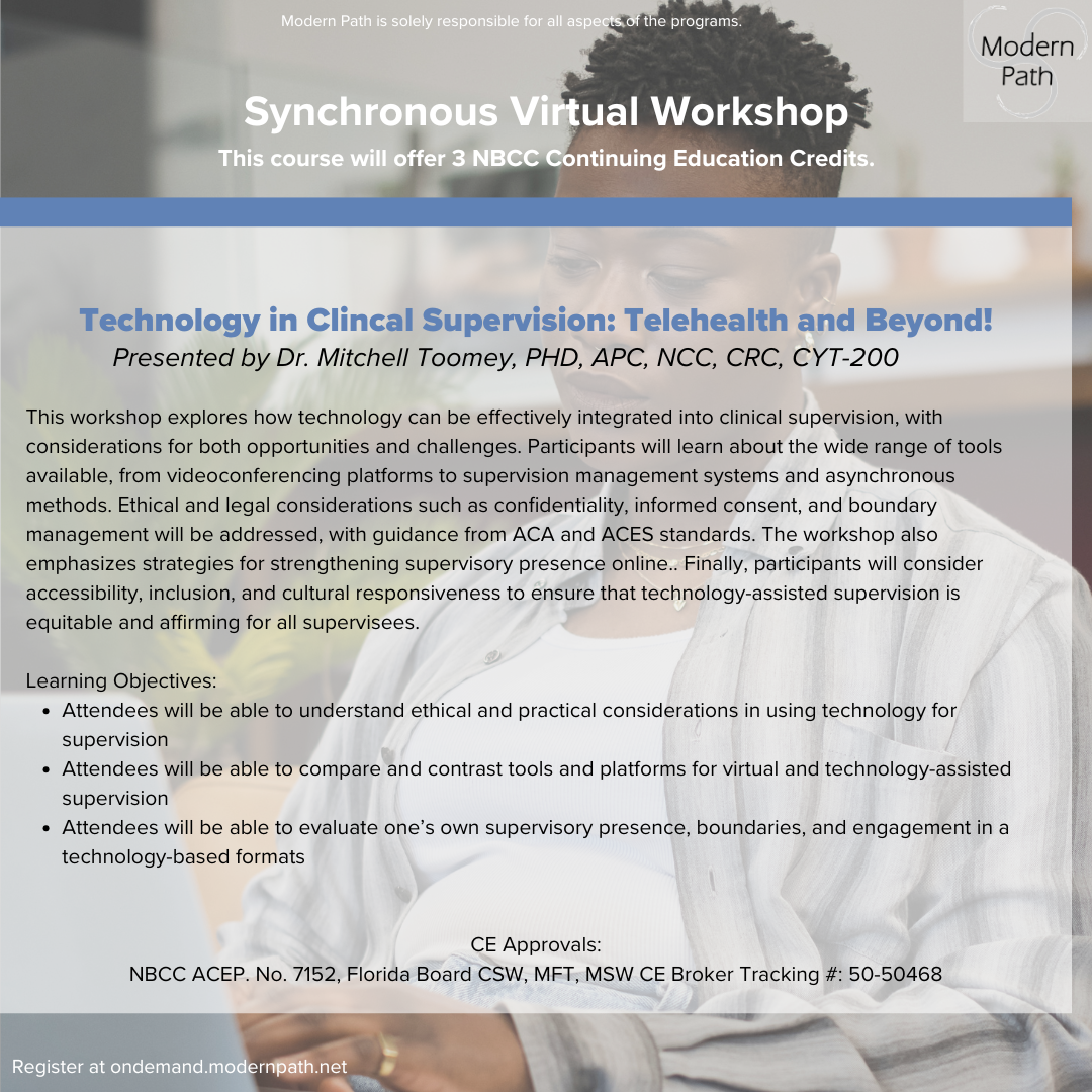 Technology in Clinical Supervision: Telehealth and Beyond! with Dr. Mitchell Toomey, PHD, APC, NCC, CRC, CYT-200